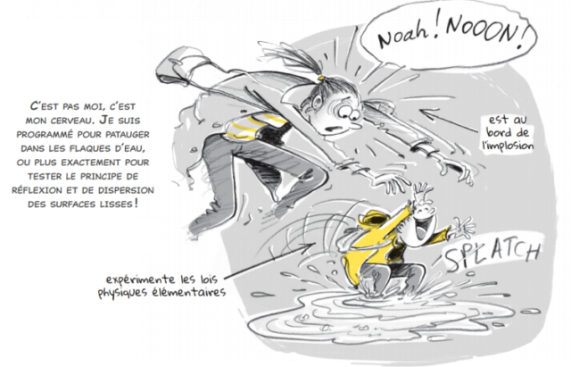 Quel parent n’a jamais rêvé d’entrer dans la tête de son bébé pour mieux comprendre son fonctionnement ? Pourquoi lui arrive-t-il de sourire lorsque vous êtes en colère ? D’où lui vient donc cette manie de patauger dans les flaques d’eau et de sauter sur les canapés ? Avec cette BD, je vous offre une immersion inédite dans la tête d’un tout-petit, Noah, depuis ses dernières minutes dans le ventre de sa mère jusqu’à son premier jour d’école maternelle. Émotions garanties !